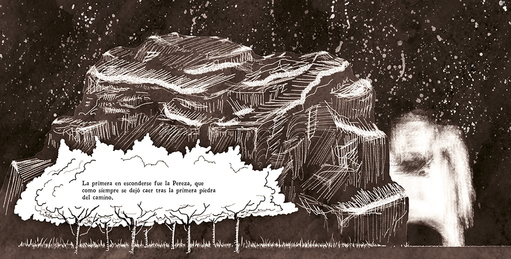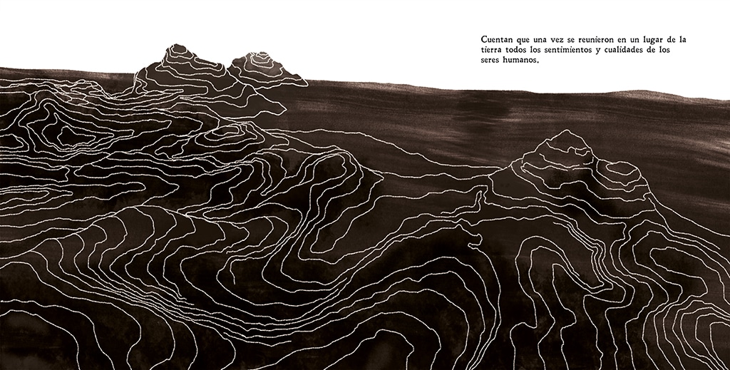 Las ilustraciones fueron creadas con técnica mixta (texturas realizadas mediante manchas de tinta y pintura digital) para este cuento sobre las emociones jugando al escondite.